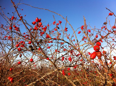 Rote Hagebutten am blitzblauen Winter-Himmel. So mag ich das Weinviertel.