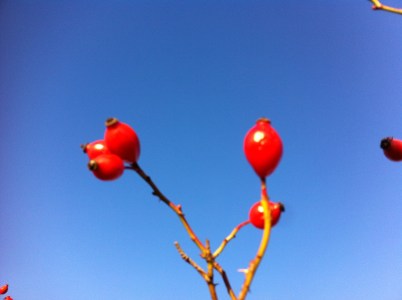 Rote Hagebutten am blitzblauen Winter-Himmel. So mag ich das Weinviertel.