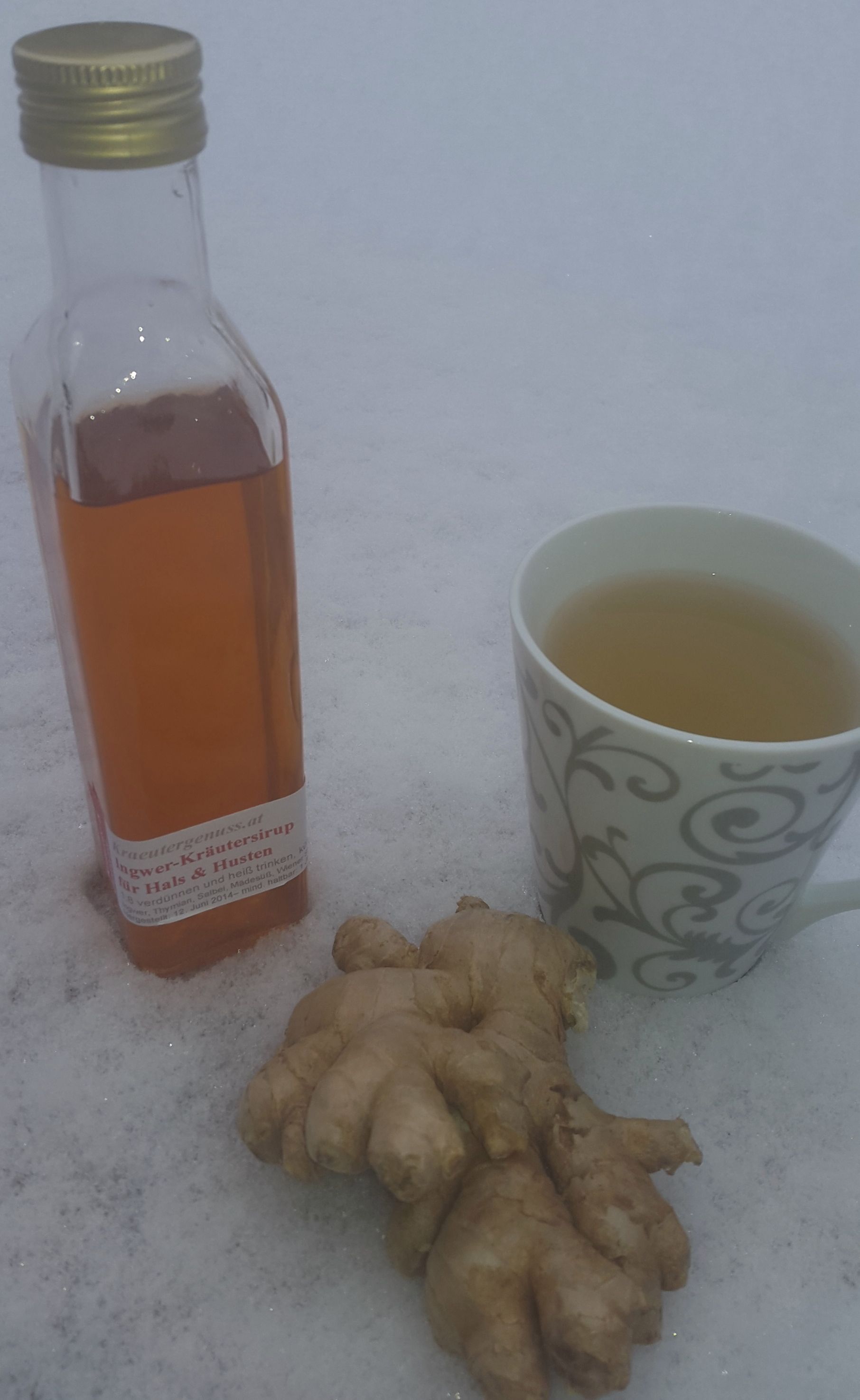 An so trüben Wintertagen braucht mal schon mal eine schöne heiße Tasse Ingwertee. Aber wer hat denn schon immer frischen Ingwer zuhause? Außerdem sind Salbei und Thymian zugeschneit und haben im Winter auch schon ihre Kräfte eingebüßt. Deshalb habe ich mir heuer im Sommer einen Ingwer-Kräuter Teesirup gebraut, den man einfach nur mit heißem Wasser aufgießen muss. Dann nur mehr auf der Couch zurücklehnen und genießen.