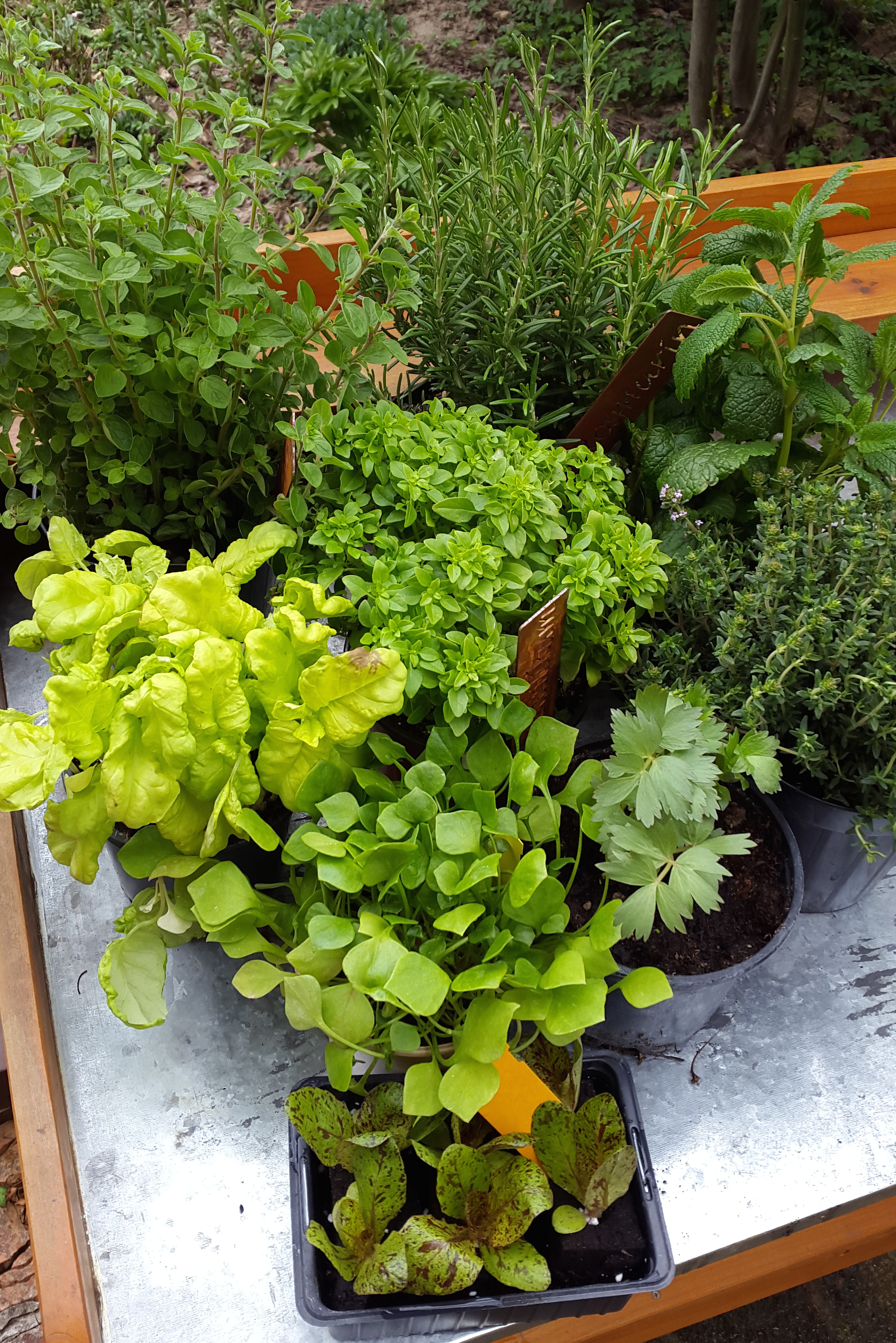 Unsere Beute: 2 Basilikumarten, Rosmarin, Thymian, Liebstöckel, Oregano, Zitronenmelisse,Winterpostelein und Forellschuss Salat – die Basis für die neue Kräuterschnecke. Dazu kommen dann noch meine alten Kräuterstöcke, die umgesetzt werden.