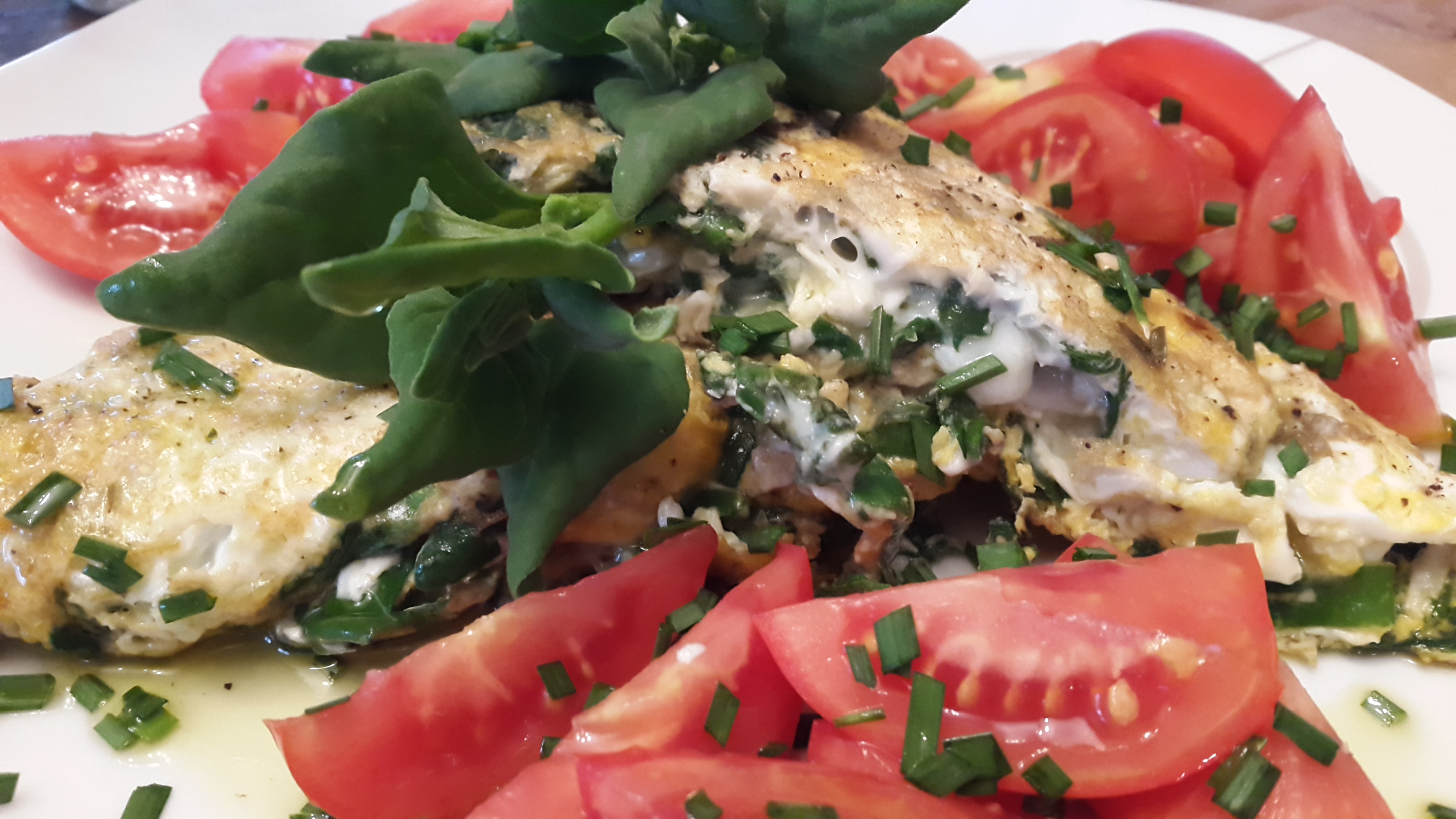 Spinatomelette Verfasst von veronikageyer am 29/07/201529/07/2015 Spinatomelette mit Neuseeländerspinat und Tomaten