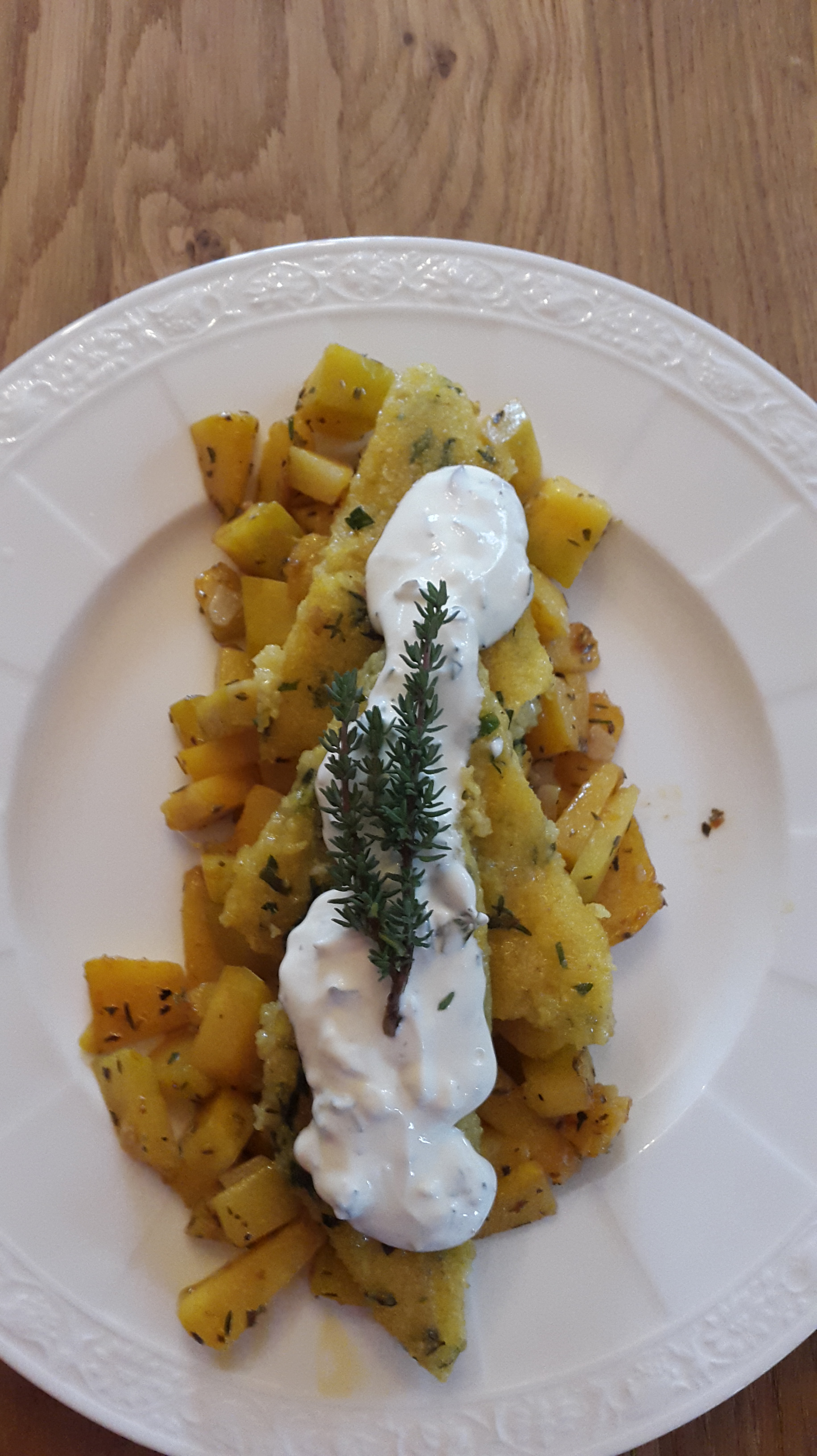 Scharfes Kürbisgemüse mit knuspriger Kräuterpolenta