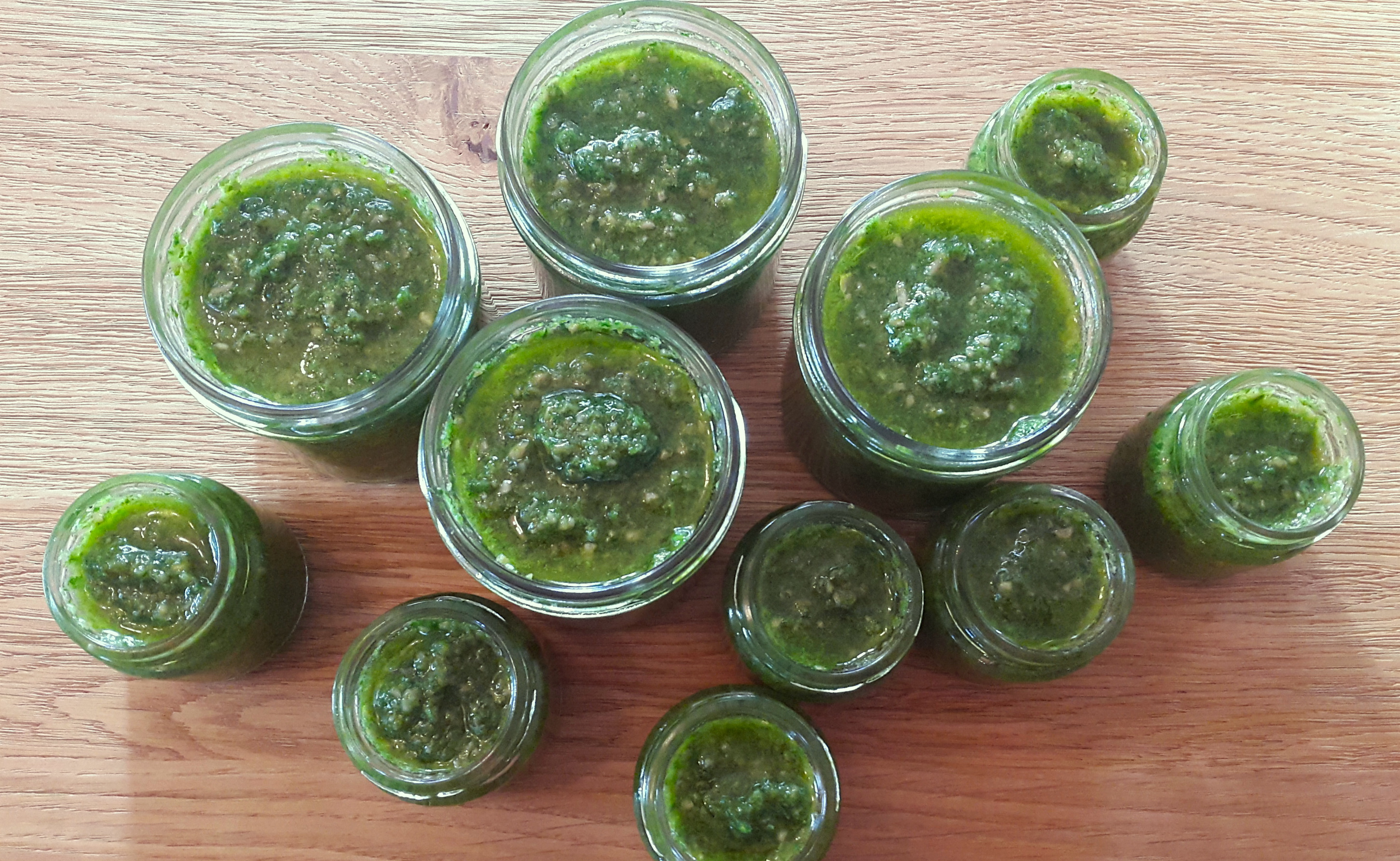In saubere, trockene Schraubgläser abfüllen, den Rand mit einer feuchten Küchenrolle sauber wischen und oben ein wenig Olivenöl drauf gießen, damit das Pesto mit Öl bedeckt ist. So hält es sich besser.