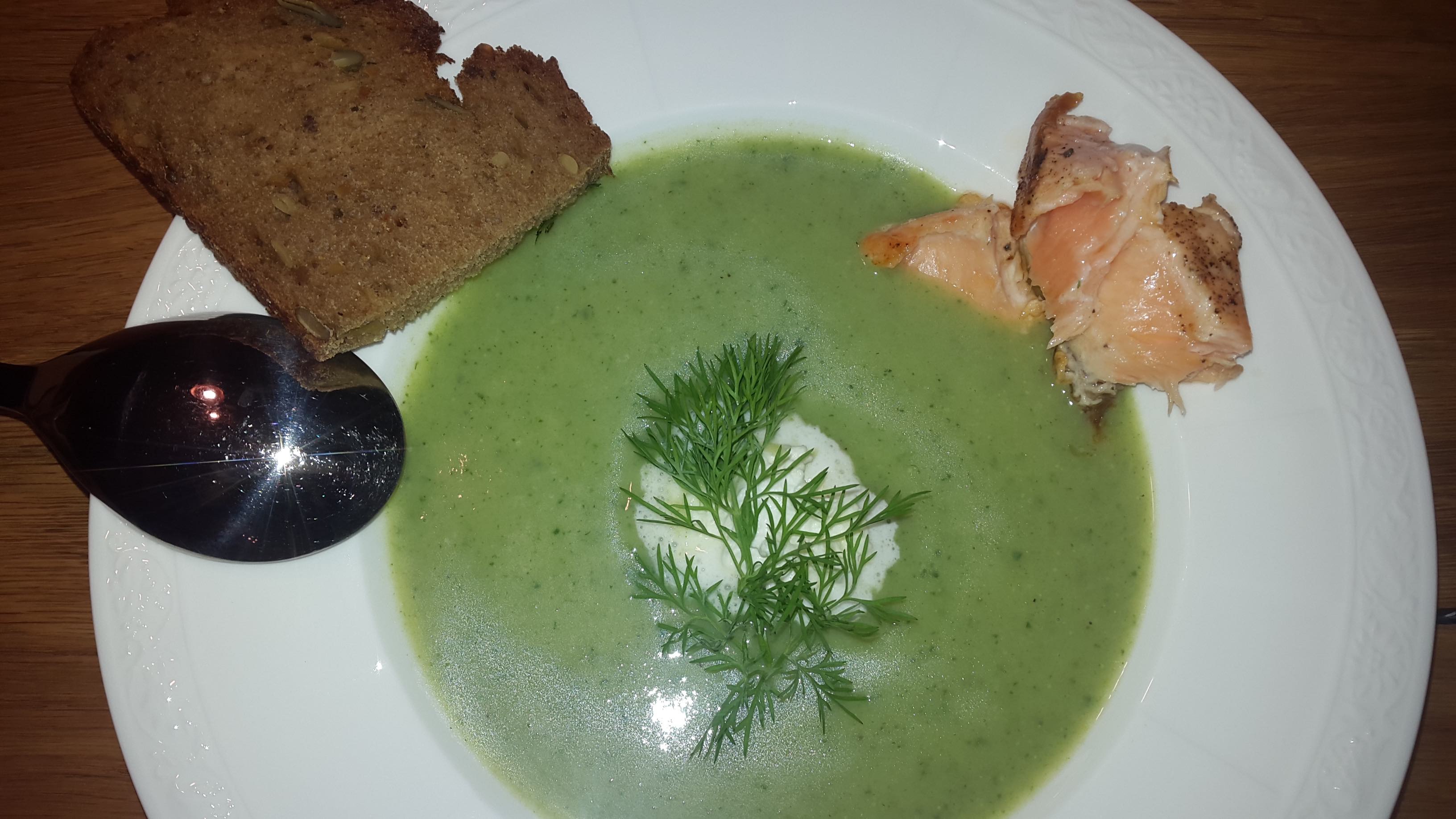 Den Lachs in kleine Stücke zerpflücken, die heiße Suppe in die Teller geben und den Lachs dazu anrichten. Mit frischen Brot servieren.