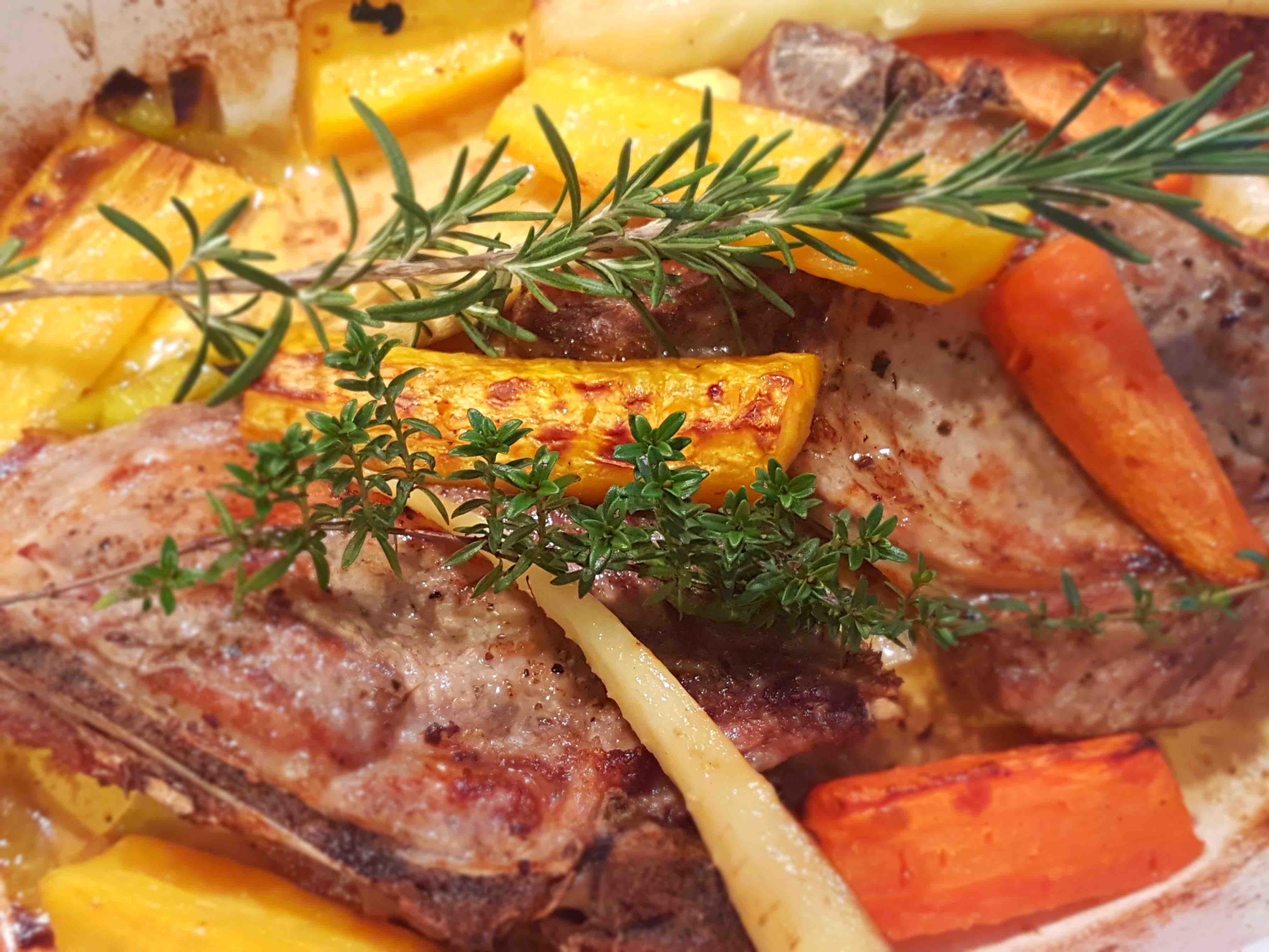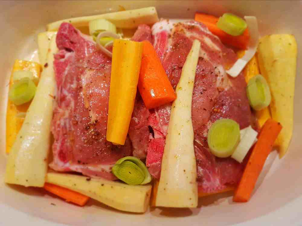 Die Pastinaken, Karotten und Erdäpfel schälen, in Spalten schneiden, kurz in ein paar Esslöffel Öl wenden, mit Kräutersalz würzen. Das Wurzelgemüse im Bräter rund um das Fleisch verteilen, eine halbe Tasse Wasser dazu geben und ab damit in den Ofen für ca. 20min. Keinen Deckel drauf geben!